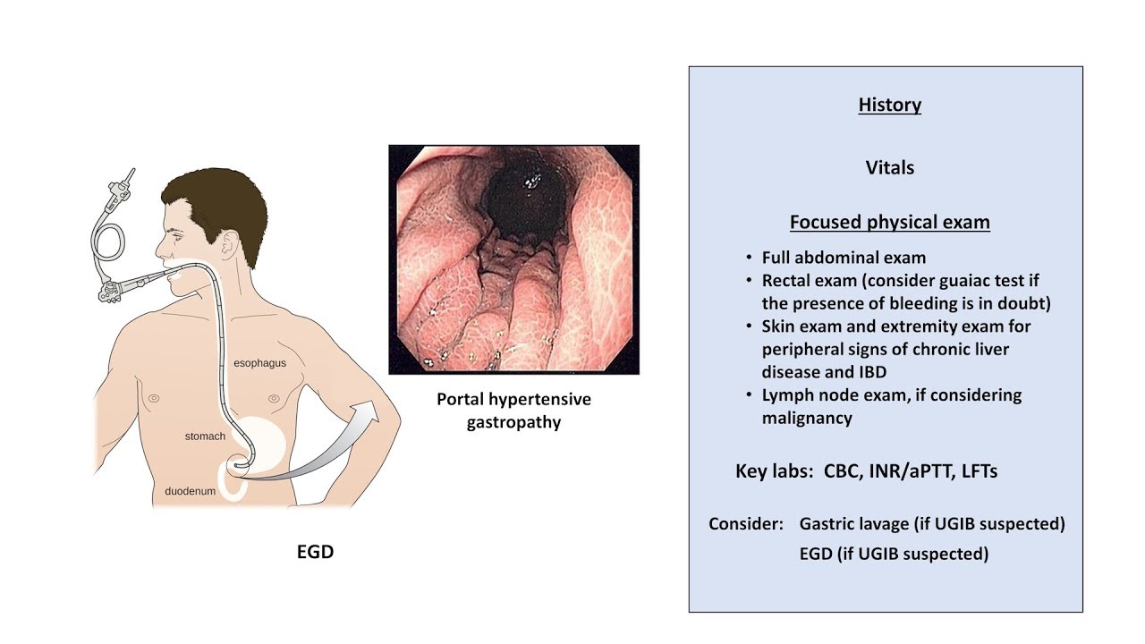 weight loss cachexia consider malignancy if you have ascites and jaundice consider varicil hemorrhage or portal hypertensive gastropathy the initial management for upper gi bleeding acute upper gi bleeding involve resuscitation insertion of two large iv cannulas performing baseline bloods including coagulation profile and group and hold and cross match administering crystalloids which will correct hemodynamics in majority also administering intravenous proton pump inhibitors and of course this can be followed by blood products and for blood transfusions there are certain indications but basically you want to transfuse everyone when there are hemoglobins less than 70. for people at higher