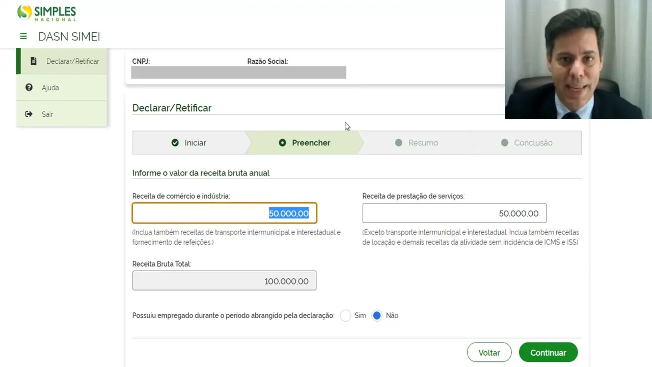 000 de comércio Vamos colocar aqui por exemplo que tenha tido aqui 40 mil reais de prestação de serviço então o total foi de 90 mil reais observa que neste caso aqui ultrapassou o limite o limite de 81 mil Então passou o limite já que está em 90 mil reais mas não ultrapassou em mais de 20%. nesse caso vou dar um continuar aqui o sistema Observe que o sistema vai fazer ele vai apurar para gente o chamado 10 de excesso que o excesso da receita bruta então nós temos uma receita bruta informada de 90 mil reais nós temos o limite de 81 mil reais então sobre 9 mil reais vai ter que calcular o dado de do sistema já faz esse cálculo aqui já que deu os valores aqui que vamos ter dentro deste dados de acesso ele apresenta uma informação aqui dizendo Olha a receita bruta ultrapassou o limite mas não ultrapassou mais de 20%, Então você tem que fazer o desencadeamento do cimei com efeitos a partir de Primeiro de Janeiro do ano calendário subsequente neste nosso exemplo aqui ficaria desenquadrada a partir de primeiro de janeiro de 2023 Então esse aqui é um detalhe continuaria que rolando a barra de rolagem e clicar em transmitir seria possível então transmitir essa declaração mas o outro exemplo Então vou voltar novamente aqui vou clicar em voltar vou fazer o seguinte exemplo agora vamos supor que tenha lá em 2022 tem ultrapassado o limite ultrapassou em mais de 20%. vamos ver como é que o sistema vai se comportar Então vou colocar aqui 50 mil reais de prestação de serviço mas vamos ter um total então em receita bruta de 100 mil reais ultrapassou então o limite ultrapassou ainda além dos 20% vamos em continuar para ver como é que é o comportamento do sistema que que ele vai dizer aqui ele está nos dizendo que olha a receita adulto ultrapassou em mais de 20%.