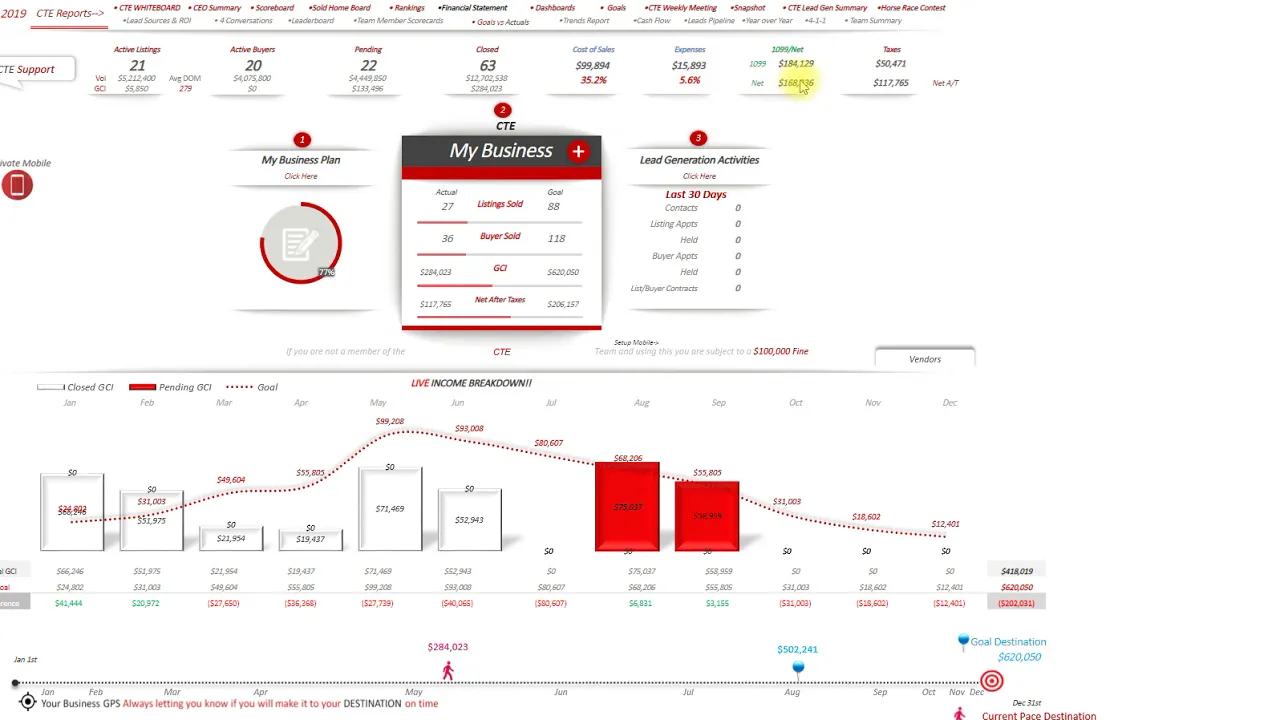 not just how much business do you do because again like I said that can be smoke and mirrors so inside of CT right on your homepage has all of these key numbers here so you can see your close production here so 12 million that sounds great I got two hundred eighty four thousand dollars closed and now I can see what are my costs of sales and what is the percentage of my business that's going to that my expenses and what percentage of my business my 1099 income my net income estimated taxes and then my net