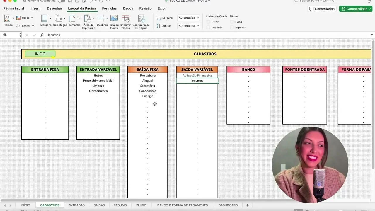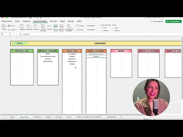 Então vamos entender como funciona a nossa planilha falta agora a hora de colocar a mão na massa e entender aqui como que vai funcionar cada aa da planilha as aulas vão ser bem curtas e rápidas para que você possa assistir e já colocar em prática tá essa é ABA inicial a partir daqui você consegue ir para todas as outras Abas então só clicando aqui você já vai E clicando aqui em início você volta para essa aba simples assim bom então vamos lá Primeiro passo é você em cadastros você vai cadastrar aqui algumas informações da sua