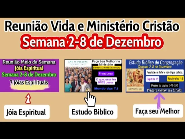 Olá meus queridos irmãos e amigos sejam todos bem-vindos mais uma vez aqui no nosso canal para juntos agora prepararmos a nossa parte vida e Ministério Cristão da semana 2 a 8 de dezembro selecionamos algumas partes de nossa reunião e aqui vai ser apresentada de uma maneira simples e prática Espero que possa ajudar cada um de vocês então vamos para o nosso vídeo [Música] então sejam todos bem-vindos É um prazer imenso ter vocês aqui no nosso canal para juntos agora prepararmos a nossa reunião de meio de semana jois espirituais da semana 2 a 8 de dezembro
