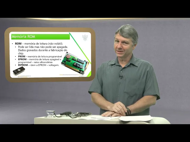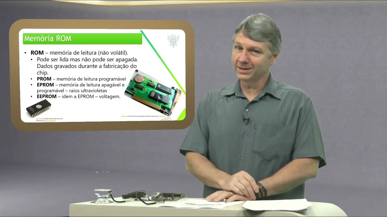 tá tem alguns problemas que estão decorrendo por conta de alguns processos que você está executando Então essa esses processos muitas vezes são corrigidos regravando essa pron como que se faz mas tem que instalar um aplicativo né para poder atualizar a chamada BIOS que vai atualizar uma pron desse daí e acontece a mesma coisa também né se por acaso você tiver atualizando uma BIOS de um computador acabar a energia tchau placa mãe tchau computador então você tem que comprar outro então custa caro cuidado com isso E aí nós temos outros tipos né tem a memória eprom