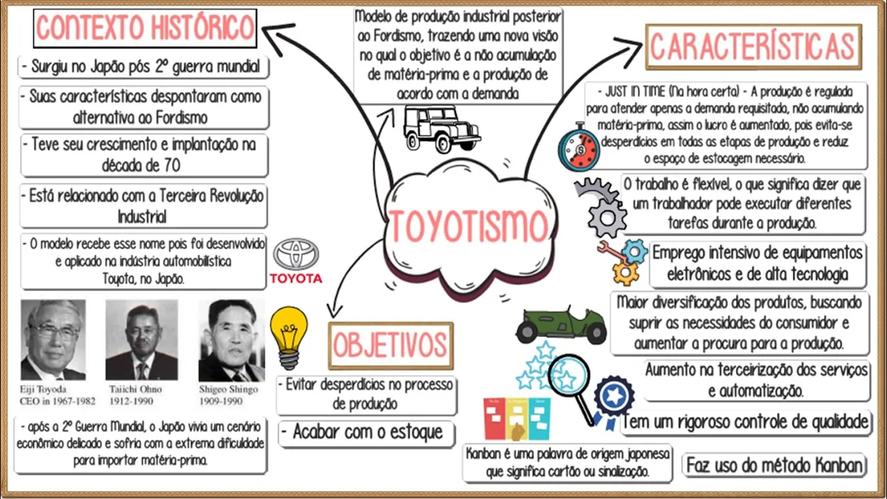 Olá hoje nós vamos falar sobre o toyotismo modelo de produção industrial posterior ao fordismo trazendo uma nova visão no qual o objetivo é a não acumulação de matéria prima e a produção de acordo com a demanda surgiu no Japão pós-segunda Guerra Mundial e suas características despontaram como alternativa ao fordismo teve seu crescimento e implantação na década de 70 está relacionado com a terceira revolução industrial o modelo recebe esse nome Pois foi desenvolvido e aplicado na indústria automobilística Toyota no Japão consume Engenheiro seja toyoda baixo no essinger singu analisaram o sistema de produção em massa características