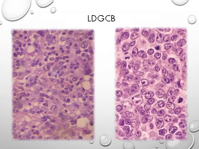 géneros como el p53 o en el 'mix' eso habla de un linfoma que tiene peor pronóstico y también se suman muchas alteraciones epigenéticas en el tórax y lógicamente este el informa de grandes son las difusos lo podemos ver sobre todo el que tiene el patrón de centro germinal donde la mayoría de las células son de tipo centro blast o esas células grandes que tenían varios núcleos en sus membranas o el patrón a veces tener células del info blastos activado donde vemos en las grandes con un núcleo lo prominente central al que llamábamos inmuno blast inmundo