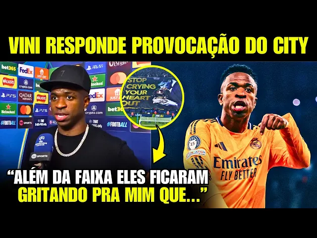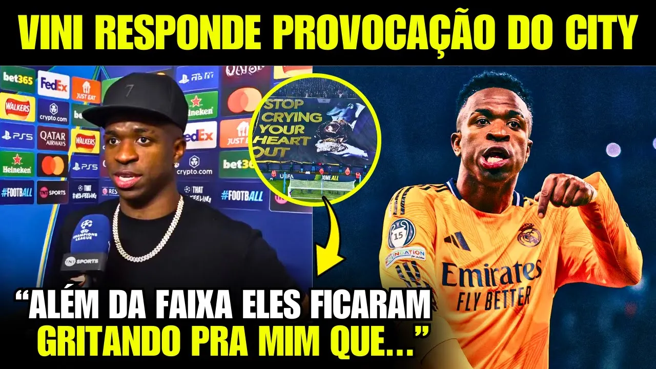 que a vitória de hoje teve um gostinho especial pro real e pro Vini não somente por tercido fora de casa mas pelas provocações que o City fez não felizes com uma provocação eles fizeram duas ambas para cima do Vini e uma inclusive vindo do próprio Clube Primeiro o perfil oficial do City postou essa foto aí nas redes do Vinnie passando perto do pôster do com a bola de ouro e depois ainda apagaram a foto depois logo na hora do hino da competição a torcida do City mostrou uma faixa com a foto do odre bola de