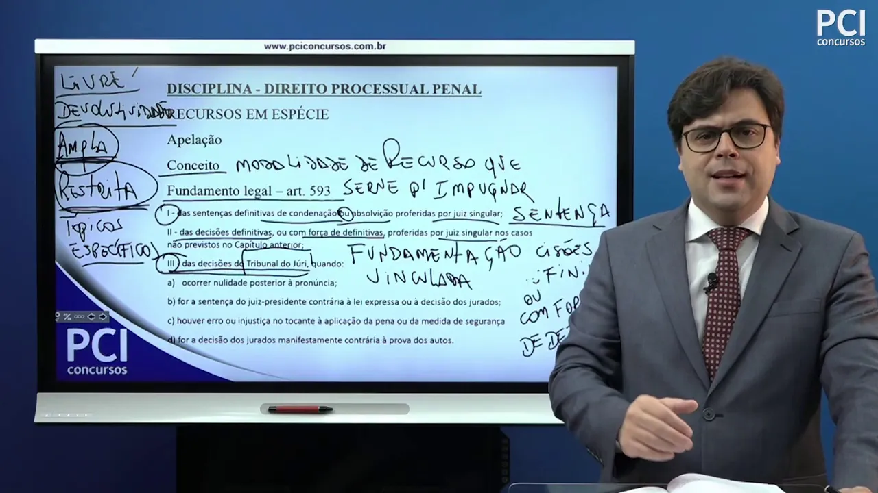 do júri o que que nós vamos é ter em mente aqui que automaticamente automaticamente as questões vão estar pré-dispostas por lei de modo que a apelação é uma apelação de fundamentação vinculada porque os temas os objetos desta apelação já estão descritos no código a fundamentação E aí é vinculada Então vamos pensar conseguinte no artigo 593 quando você pensar em sentenças definitivas de Condenação ou absolvição proferidas pelo juiz singular e aqui o conteúdo da apelação a criticar essa sentença de Condenação ou absolvição um pouco importa Pode ser todo e qualquer fundamento porque a fundamentação aqui é