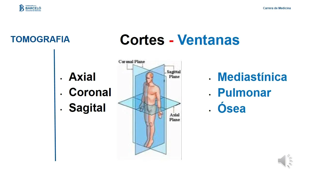método densidad veo una imagen hiperdensa veo el hueso veo una imagen hip una imagen isodensa de igual densidad al tejido que estoy comparando en la tomografía vamos a hablar de cortes y ventanas los cortes los voy a realizar en los tres planos axial coronal y sagital y las ventanas diferentes estudios tienen diferentes ventanas por ejemplo cuando vamos a hablar de una ventana de fía pulmonal vamos a poder evaluar una ventana mediastínica O sea que yo en esa ventana voy se va a Resaltar sí la ventana mediastínica la ventana pulmonal o la ventana ósea sí no