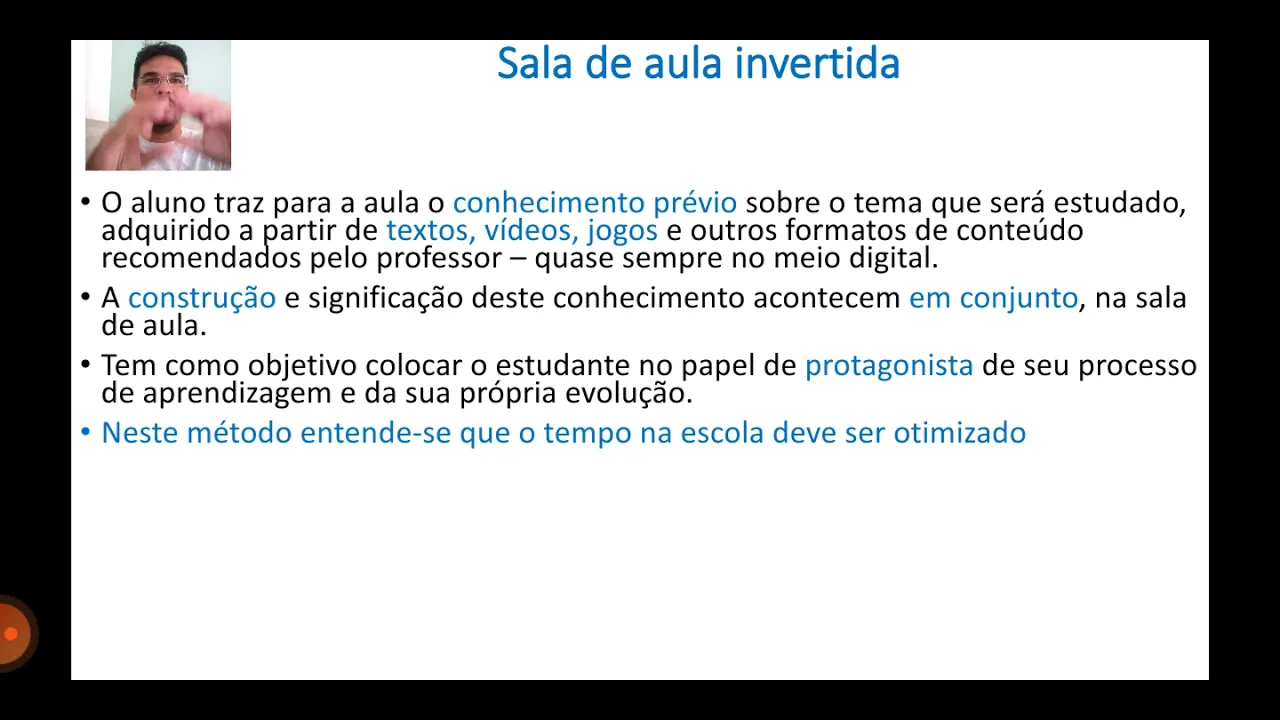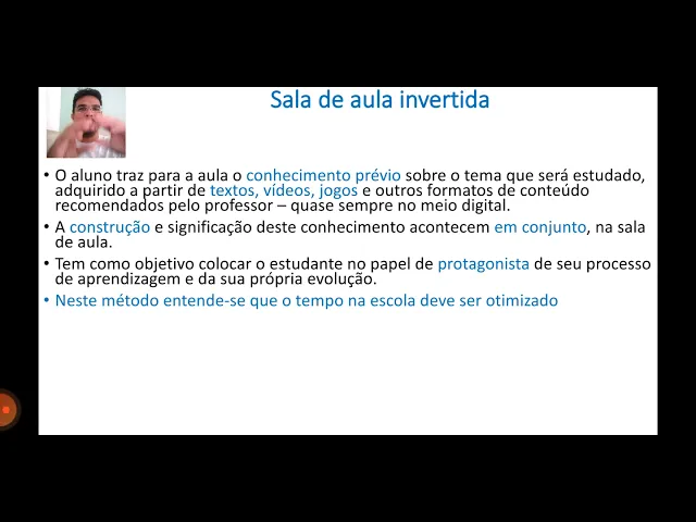aula invertida assim como destino híbrido é utilizar o tempo na escola como professor Às vezes o professor numa determinada série determinada escola e tudo ele passa dos 50 minutos de aula ele paz o minutos só para organizar a sala para pedir silêncio tudo mais para sossegar mas 10 minutos para fazer chamada perdendo muito tempo 30 minutos ele tem que trabalhar uma teoria aplicar aquela teoria trabalhar atividade saber se entenderam uma sala de aula invertida os Defensores desta técnica deve ser em que o trago o tempo na escola porque a mais utilizado porque eu vou trabalhar