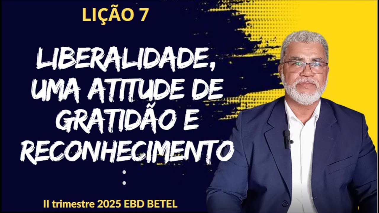para tirar as dúvidas e é na terceira leitura que vai surgir ali a aula. para vocês. Por isso que é importante te botar aqui o slide, o aula, pré-aula, porque você Vai ouvir, mas depois você vai ler e vai tirar aí as suas própri próprias conclusões para não fazer uma um um comentário aí apressado, né? Falar: "Ah, é isso, é aquilo". E depois você vai acabando, né? Eh, se surpreendido pelo tema. Esse é o caso da lição eh sete. Parece uma uma repetição porque ele tá falando da liberalidade, uma atitude de gratidão e reconhecimento. A