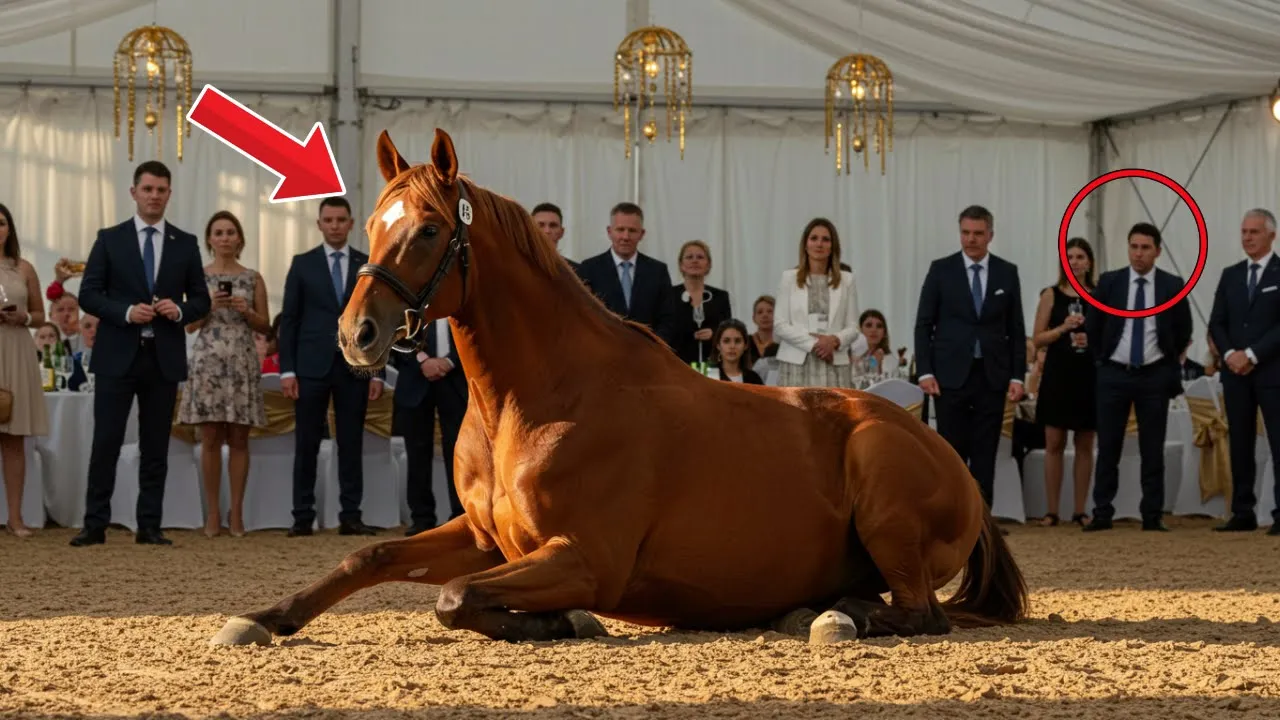 The grand auction hall buzzed with murmurs and disinterest as the spotlight fell on a horse lying motionless in the center of the ring. The chestnut stallion's coat was marred with scars, telling silent stories of hardship and neglect. The auctioneer's voice rang out, desperate to spark interest.