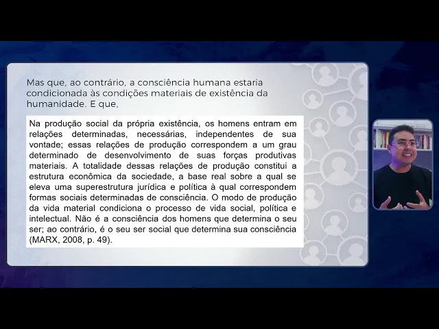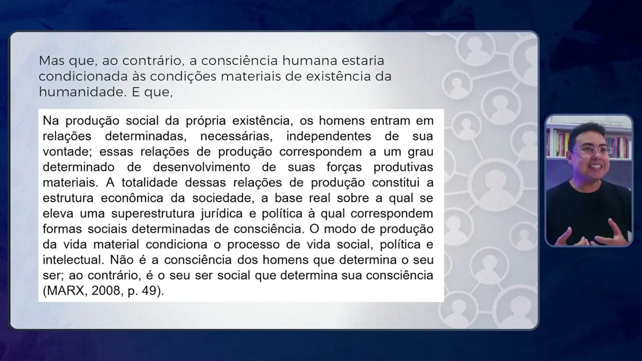 fizesse lá parte do clero ou você fosse um servo um camponês trabalhando lá na terra trabalhando na agricultura não é você que escolhe isso é isso que a citação Traz logo no início é independente da sua vontade você é fruto da época em que você nasceu e das condições que são dadas então o modo de produção da vida material acaba condicionando o processo da nossa vida da nossa vida social da nossa vida política da nossa vida intelectual Ou seja é a realidade concreta que vai influenciar a nossa consciência e aí a citação continua não é