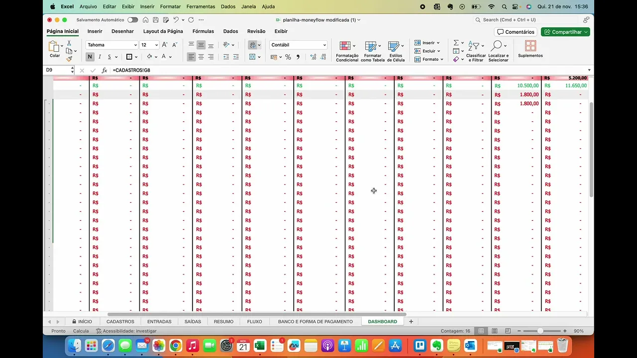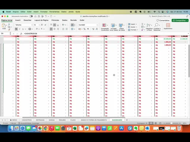 000 nessa de reserva Então você coloca como uma aplicação financeira por também está saindo do seu negócio também está é um dinheiro que está saindo do seu mês Só que a gente enxerga também separado porque na verdade a gente usa o lucro para investir o nosso dinheiro pras metas porque uma reserva para um equipamento por exemplo ou montar o caixa ou montar reserva financeira do seu negócio seu consultório da sua clínica da sua sala do seu estúdio você vai pegar daqui do lucro líquido então do lucro Você tem uma disponibilidade ali para aplicar o seu dinheiro nas metas que você tem pro seu negócio negócio e o saldo em conta tá o saldo em conta então ele vai ser o saldo Inicial porque você já pode entrar no mês com algum dinheiro na conta vou te falar sobre isso mais o lucro menos a sua aplicação financeira Esse é o dinheiro que você vai ter em conta aqui você vai fazer o quê todos os esse saldo Inicial eles são automáticos tá o saldo Inicial ele é automático para todos os meses menos em janeiro então quando você for começar não importa o mês que você esteja tá quando você for começar coloca aqui o saldo Inicial atual que você tem tá Nati mas eu tô começando Em Julho eu vou colocar lá em janeiro sim então se você começar em Julho a organizar vamos supor que você comprou essa planilha e vai começar em Julho você pode pôr o seu saldo inicial do momento e seguir não tem problema nenhum tá você vem aqui e coloca por exemplo 15. 000 mas se você for começar Nati eu comprei em em abril mas eu quero lançar Desde janeiro então eu vou lá olhar na na minha conta bancária nos meus estratos nos meus cartões e eu vou lançar tudo desde Janeiro Aí sim esse saldo Inicial precisa ser o saldo Inicial lá de Janeiro aí você vai ter que procurar tem bancos que mostram no próprio estrato ali no aplicativo Você já consegue ver qual era o saldo da conta em cada dia do mês ou em cada dia pelo menos que teve alguma movimentação Então procura lá no seu estrato bancário que Muito provavelmente vai ter depende do seu banco Enfim então recapitulando se você for começar eh no mês que você comprou pode colocar o saldo Inicial atual e seguir se você for lançar Desde janeiro e você não estiver em janeiro tiver mais paraa frente do ano aí você precisa colocar o saldo Inicial lá de Janeiro combinado Aqui nós temos dois gráficos do seu lucro líquido gente a coisa mais importante de um negócio é o lucro nós precisamos de lucro lucro lucro lucro lucro é o que faz o negócio viver faturamento é importante demais só que o faturamento ele é só um valor de venda se nós não tivermos lucro não adianta você vender milhões de reais se não tiver lucro tá então já vi casos de lugares de negócios que vendia 2 milhões ano quando vai ver o o proprietário não conseguia tirar nem 20. 000 de prolabore para ele por mês porque não tinha lucro mesmo vendendo milhões mesmo faturando milhões então o lucro é um indicador muito importante dentro do seu negócio e esse lucro líquido nada mais é do que a margem de lucro tá é sua margem de lucro lucro e Aqui nós temos um outro gráfico que são as suas entradas versus o lucro líquido essas entradas é o seu faturamento a gente até deixou aqui já em para você entre parênteses essa questão de faturamento porque é legal que você vai começando a se apropriar de alguns nomes chatos do mundo do dinheiro mas que são muito importantes e relevantes pro seu negócio tá então entrada a gente pode dizer que que é o seu faturamento aqui então entradas versus lucro líquido para você entender quanto do seu faturamento de fato sobra ali como lucro são formas são visões diferentes para enxergar os mesmos números tá então os números que estão aqui só que você enxerga em forma de gráfico para facilitar aí o que nós teremos aqui tá vendo que tem esse mais esse mais aqui esse mais significa o que se você clicar ele vai abrir para você todos os seus custos variáveis um a um e ele vai te dar sim esses valzin separados só que não precisa ficar abrindo a ideia nem é nem é na verdade para que vocês fiquem abrindo a ideia é que vocês vejam o total e só lembrando que o que vai estar aqui nesse dashboard é o que você colocou aqui na dre a gente vai eu vou até renomear aqui para vocês dre pronto assim fica fica mais fácil o que vai estar nesse dashboard o que você colocou como dre então exemplo vamos pegar um exemplo aqui essas datas não estão 100% corretas fo só mesmo aí alguns exemplos para vocês conseguirem enxergar os números aqui aqui na frente ó exemplo esse procedimento tá aqui como a data 7/11 isso quer dizer que eu vou receber o dinheiro em 7/11 porém eu Realizei o procedimento lá em outubro então eu coloco aqui outubro porque a dre é quando de fato Eu vendi aquele procedimento quando que eu vendi aquele produto quando eu vendi aquele serviço Qual foi o mês que eu vendi aqui é quando o dinheiro vai entrar no meu caixa então aqui ele traz para mim o qu que ele me traz a dre aqui ele me traz tudo que está aqui exemplo nós temos aqui de outubro estou dizendo que entrou 10.
