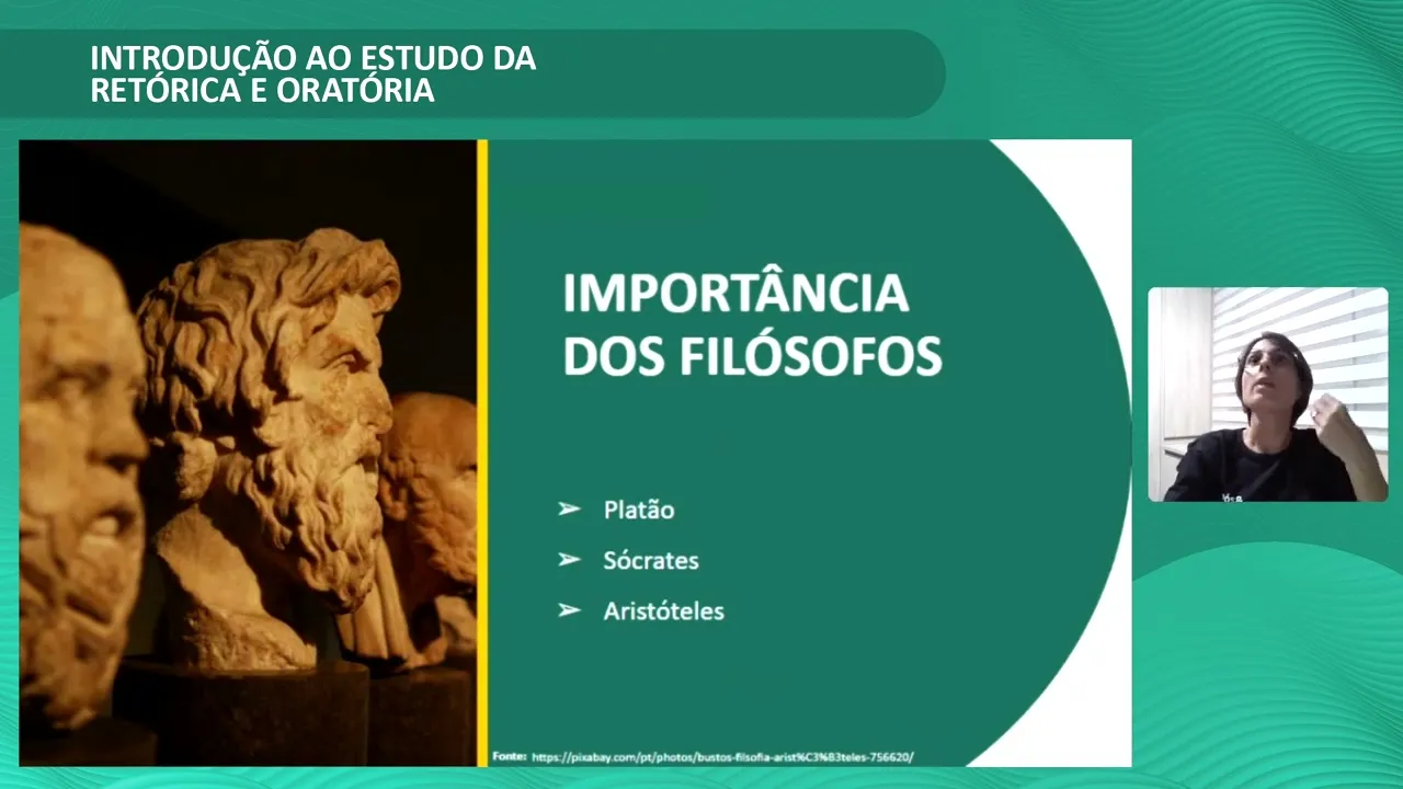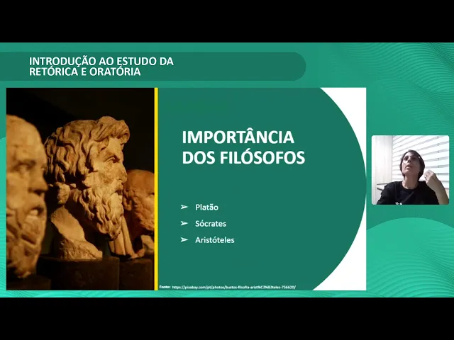 Por isso, que o estudo eu caracterizo como um pouquinho complexo na teoria, mas faz sentido. Precisamos ter pensadores, precisamos ter conhecedores do assunto para construir realmente toda essa base, toda essa bagagem de conhecimento para que tudo fique pronto como está agora para a gente estudar. Grandes filósofos marcaram a sua presença nesse estudo da retórica e oratória, como Platão, Sócrates, Aristóteles.