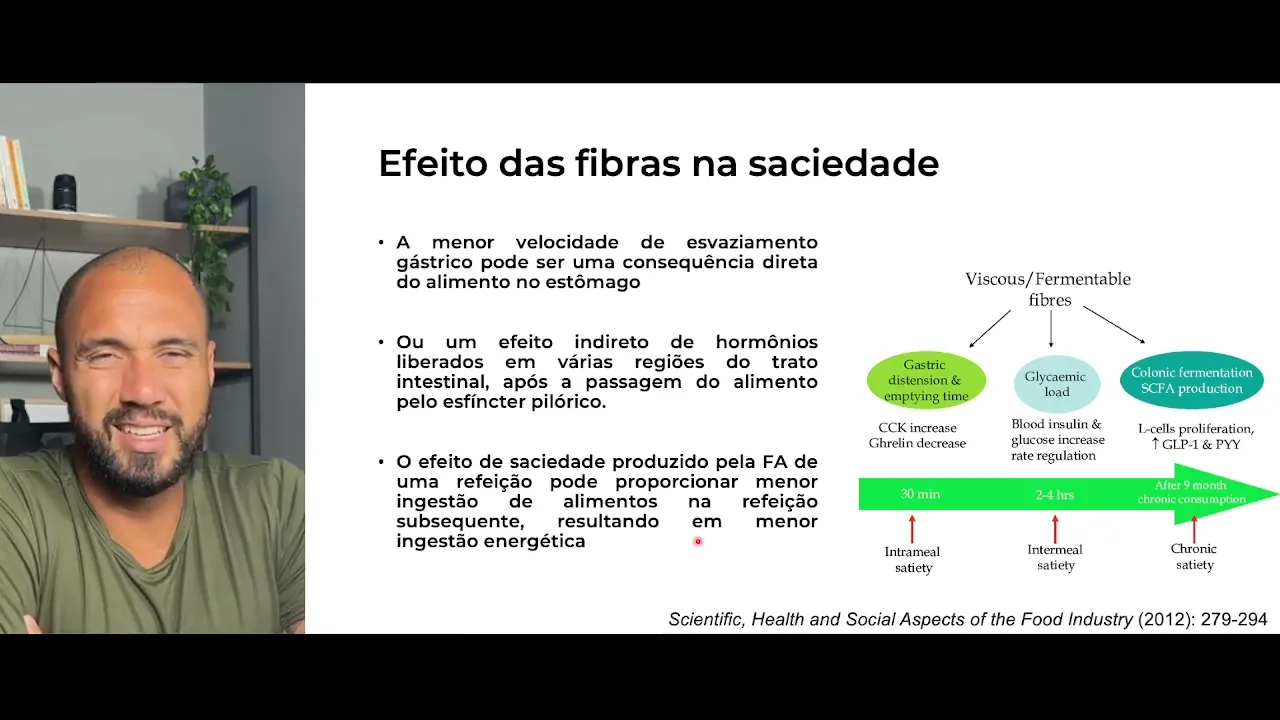 melhor controle de saciedade maior proliferação de células l no intestino que aumentam a secreção de incretinas como glp1 e o o polipeptideo Y por exemplo e também estão Associados são são hormônios né incretinas Associados à saciedade então o efeito da saciedade das fibras produz eh das fibras dietéticas são Agudos eh São momentâneos né durante a refeição de efeito moderado e de efeito crônico também então perceba que a ingestão regular de fibra traz benefícios em relação à saciedade algo que você busca seu paciente saciedade o ideal é que você aumente a ingestão de fibras e o