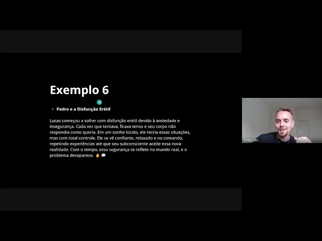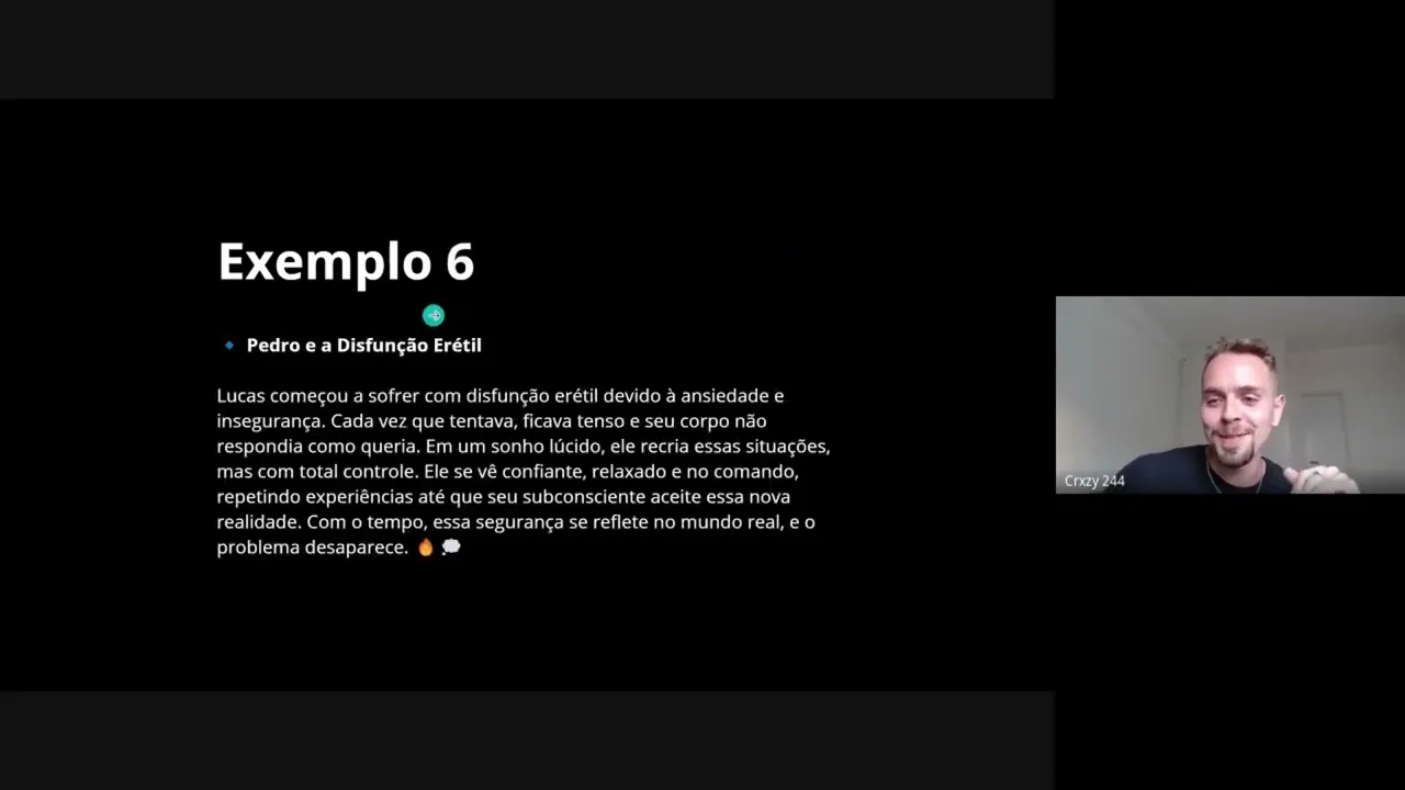 bloqueado e sem ideias para seu próximo livro ele não Sabe o que que ele vai escrever e aí ele entra num sonho lúcido e entra no mundo de suas histórias ganham vida ele interage com os personagens ele descobre novas tramas e quando ele acorda ele vai lá Anota tudo e percebe que desbloqueou uma fonte inesgotável de criatividade dentro da cabeça dele outro exemplo Pedro e a disfunção herética cara eu botei o Lucas aqui mas é o Pedro O Pedro começou a sofrer com expulsão erétil deidda ansiedade e insegurança cada vez Que ele tentava ele ficava