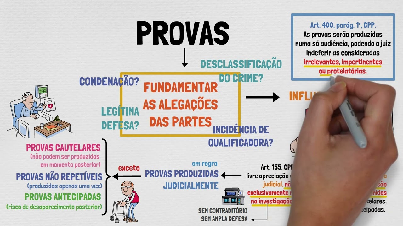 imputado do mesmo modo se a defesa traz ao processo teses defensivas como por exemplo invoca a legítima defesa também precisará comprovar o alegado desta maneira a prova objetiva fundamentar as alegações trazidas pelas partes a fim de influenciar na decisão final do julgador que é o destinatário da prova para tanto a produção de provas será norteada por alguns princípios vejamos alguns deles o princípio do contraditório exige que após a apresentação de Nova prova nos autos a parte contrária tem a prog ativa de se manifestar sobre a comunhão dos meios de prova é o princípio que externa