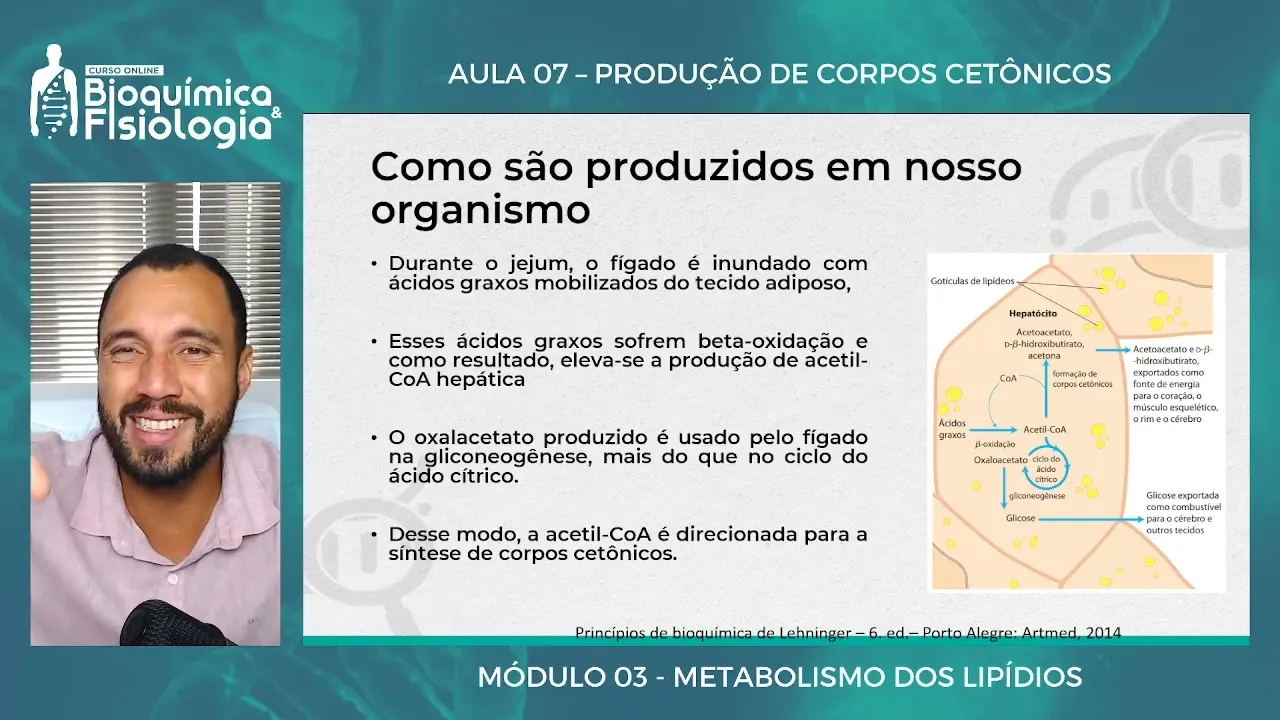 Olá tudo bem seja muito bem-vindo a mais uma aula nessa aula de número sete nós iremos falar um pouco sobre a síntese de Corpos cetônicos a produção de corpos cetônicos em nosso organismo na última aula né onde a gente abordou a a lipólise e a oxidação de ácidos grassos a gente já mostrou em qual ponto essa síntese de Corpos cetônicos acontece em nosso organismo mas a gente precisa contextualizar entender Em qual contexto a síntese de Corpos cetônicos ocorrem em nosso organismo então o nosso foco é discutir esse processo da produção desses três corpos cetônicos o