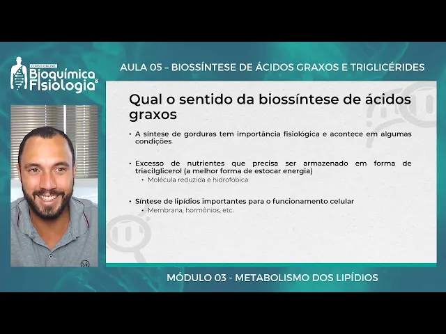 Olá tudo bem seja muito bem-vindo a mais uma aula do nosso módulo TR sobre o metabolismo dos carboidratos nessa aula nós iremos falar sobre a biossíntese de ácidos grassos a biossíntese de lipídios os principais lipídios né que nós utilizamos como energia e também como como armazenamento de energia como estoque de energia vamos lá e o primeiro passo né É É entender que síntese de ácidos grassos é diferente de engordar certo síntese de ácidos graxos envolve um processo P no qual o nosso corpo sintetiza uma molécula de ácido grso a partir de um composto não lipídico